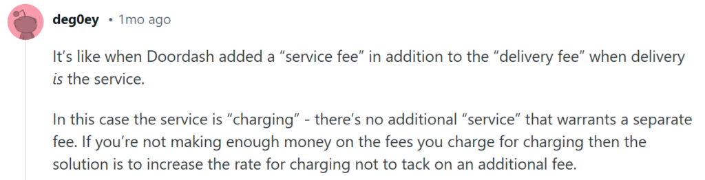 And on the reddit.com r/electricvehicles forum (opens in a new tab), one user commented that, “It’s like when Doordash added a “service fee” in addition to the “delivery fee” when delivery is the service. In this case the service is “charging” – there’s no additional “service” that warrants a separate fee. If you’re not making enough money on the fees you charge for charging then the solution is to increase the rate for charging not to tack on an additional fee.”